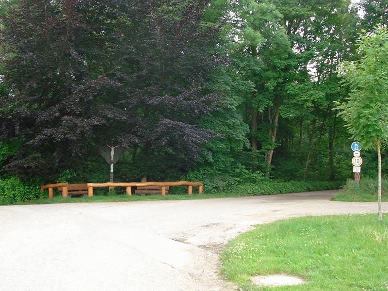 Diese Straße, im weiteren Verlauf Bruckweg genannt, führt aus der Ortschaft nach Süden heraus zu einem imposanten Wegekreuz.